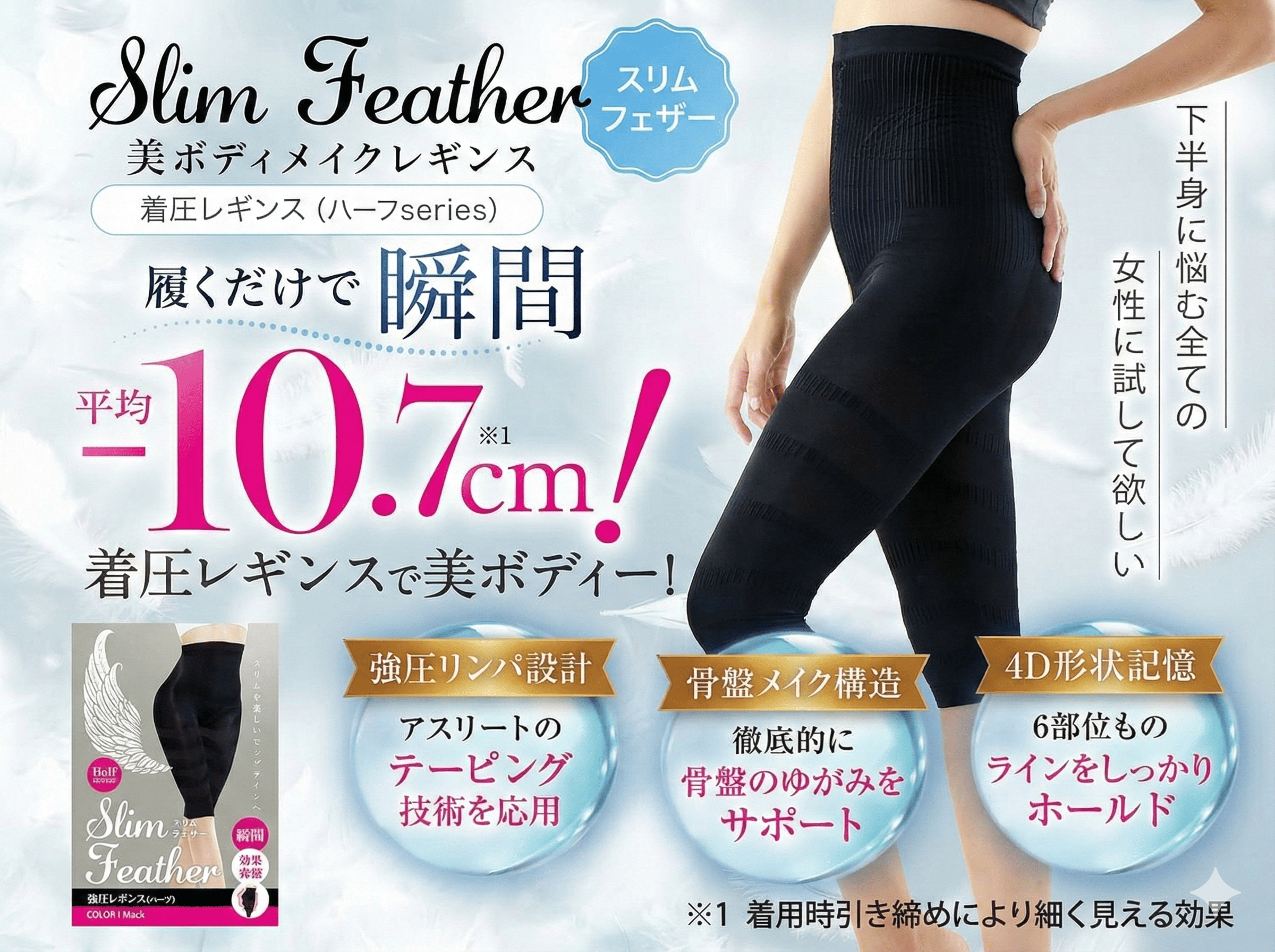 【3枚】Slim Feather 着圧レギンス(ハーフ)+ 【1枚】Leg Featherプレゼント【送料無料】
